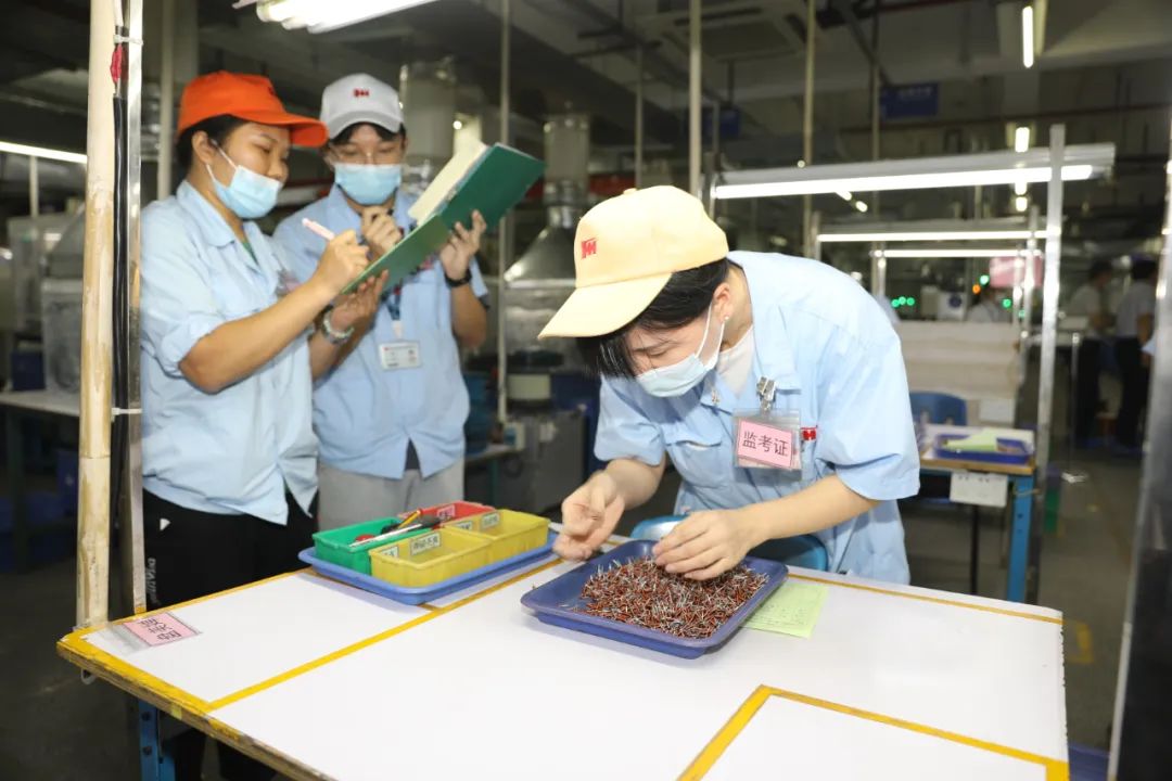 本次比拼的是電感分公司繞線車間引線功率崗位,他們根據崗位技能性質,主要檢驗選手的分選、點膠、焊錫等技能。在兩小時的比拼中,選手們全神貫注,額頭上晶瑩剔透的汗珠順著臉龐緩緩滴落,映照著一張張沉著應對、精心操作、一絲不茍的面孔。他們圍著工作臺不停地進行測量、配裝,扎實的基本功在這一刻得以“綻放”。經過激烈的比拼,共評選出“崗位操作技術能手”22名及“優秀生產班組”1個。