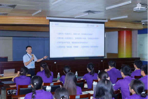 公司黨委委員、紀委書記、監事會主席丘旭明以《堅持廉潔從業,扣好“第一粒扣子”》為題,對全體新員工開展了一場從業廉潔教育培訓。他以發問形式引導大家進入廉潔思考,以警示教育片切入課程內容,從業的重要意義、主要規定、如何扣好廉潔從業“第一粒扣子”三方面進行了課程講授。