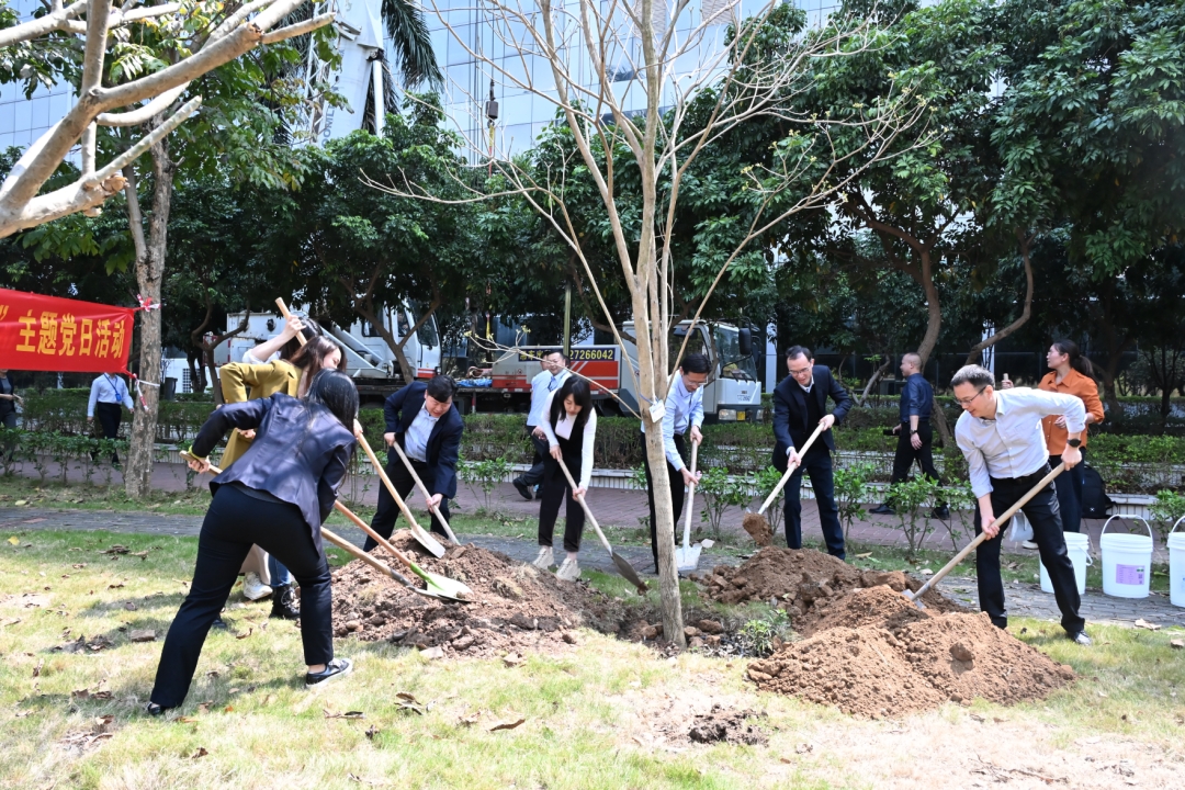 活動現場,廣晟控股集團和風華高科公司領導帶領眾多黨員熱情高漲地投入到植樹勞動中,大家齊心協力,揮鍬鏟土、培土圍堰、提水澆灌,干勁十足地“共植一棵樹”。頃刻間,公司小花園里增添了各種新樹苗,涵蓋紫花風鈴木、銀鱗風鈴木、鳳凰木、雞蛋花等品種。這些樹苗不僅為公司增添了一道亮麗風景線,更在黨員們心中種下了生態文明的種子。