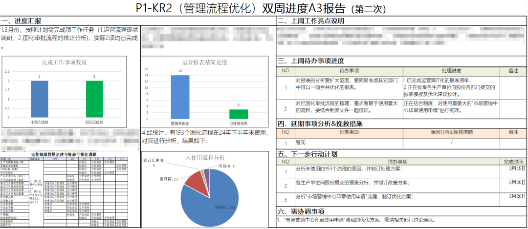 雙周聚焦復盤。每兩周組織各項目經理對照目標清單,輸出“A3一頁紙報告”簡潔有力地呈現項目進程、剖析現存問題、規劃改進路徑,讓項目動態清晰聚焦,便于項目團隊及時把控項目節奏。