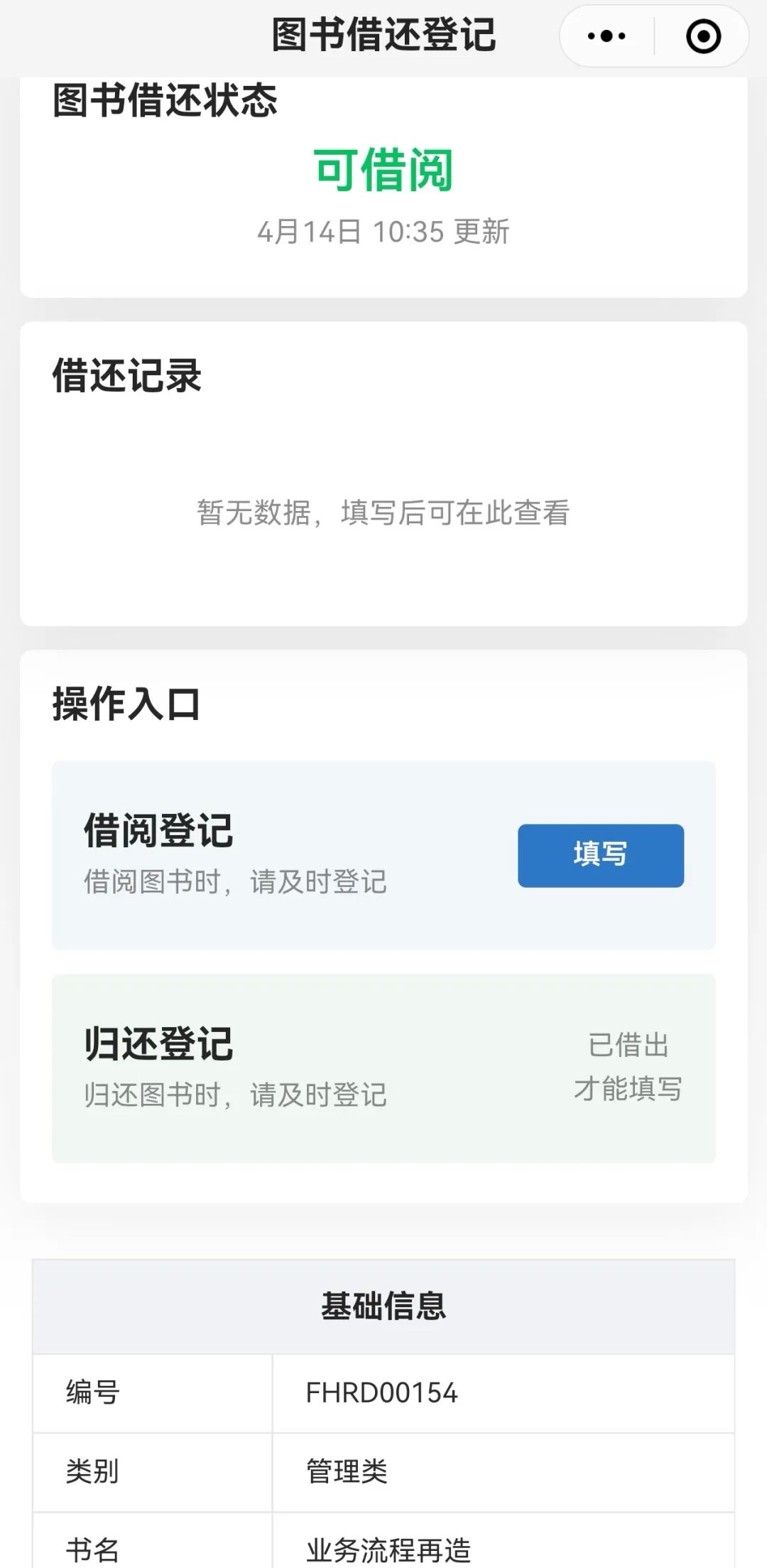 研究院創(chuàng)新打造信息化讀書角,充分發(fā)揮數(shù)字化、便捷化優(yōu)勢?,采用“二維碼管理”模式,為200余冊書籍配備專屬電子身份證?,實(shí)現(xiàn)“掃碼即借、一鍵歸還”。管理員可通過后臺實(shí)時監(jiān)控借閱頻次、熱門書目等數(shù)據(jù),科學(xué)優(yōu)化書籍配置,讓資源流轉(zhuǎn)更高效。實(shí)現(xiàn)“一碼通辦”后借閱流程耗時從傳統(tǒng)人工登記的5分鐘縮短至10秒,效率提升97%,大幅降低書籍遺失率和管理成本。