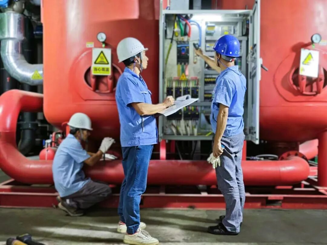 ▲風華高科工作人員對空壓機配電設施測溫及閥門狀態檢查
